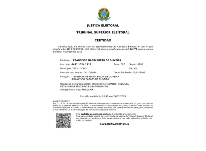Certidão de quitação eleitoral emitida pelo Tribunal Superior Eleitoral (TSE) comprova que o parlamentar está quite com todas as suas obrigações eleitorais, incluindo exercício do voto, inexistência de multas e situação cadastral regular.