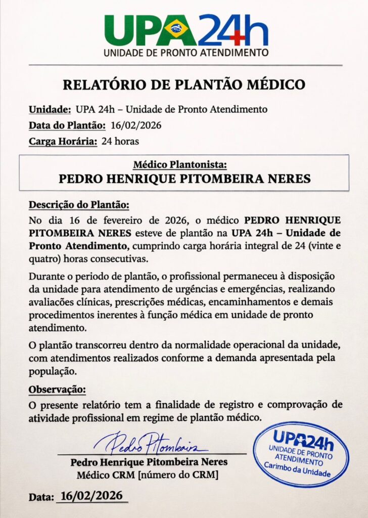 Acompanhe o Documento que comprova que no dia em Pedro Neres estava agredindo e trocando socos no carnaval era pra ele está de plantão na UPA de Codó: