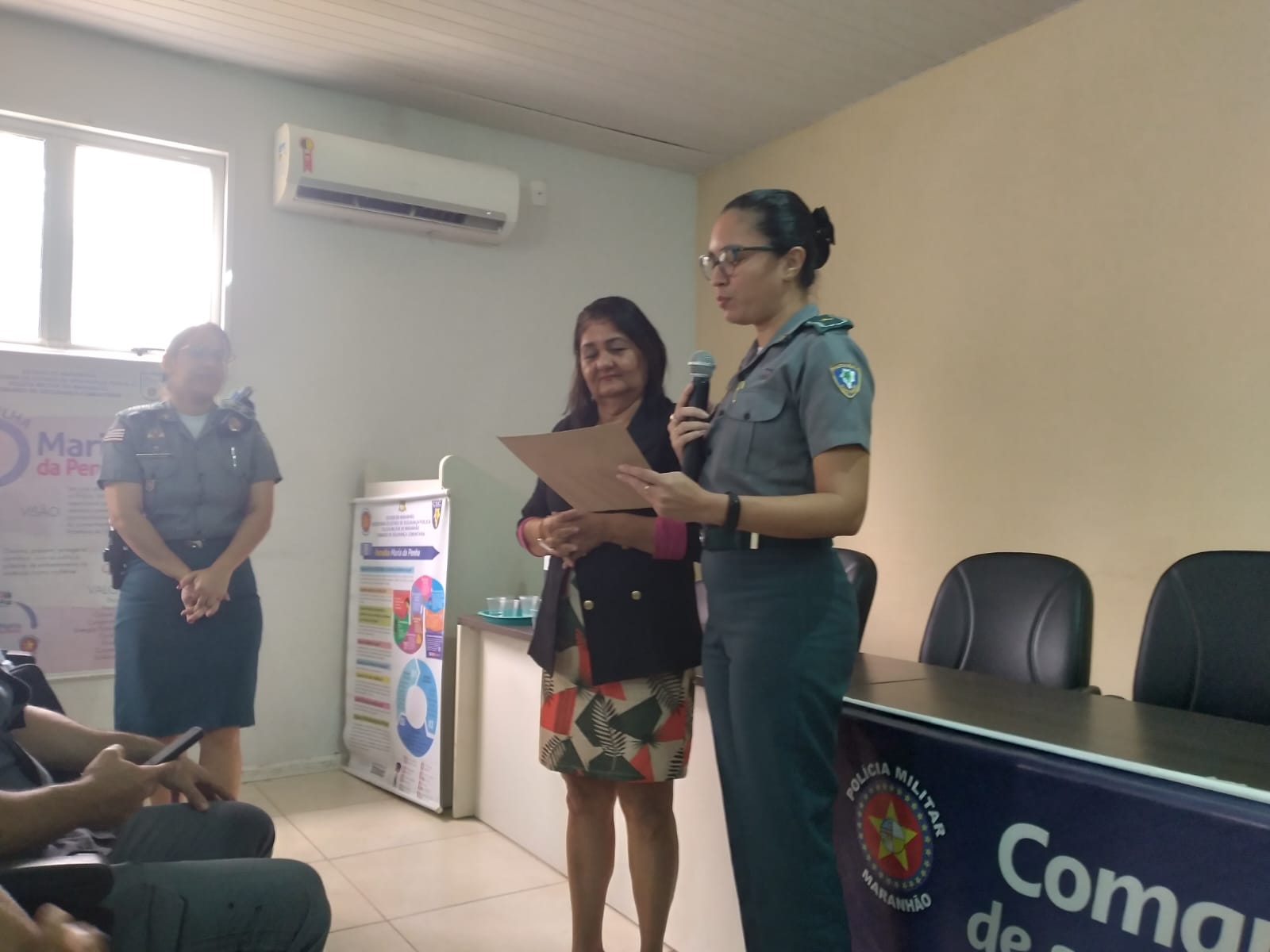 “Desde a implantação da Patrulha Maria da Penha na cidade de Bacabal, a Subseção da OAB de Bacabal e as comissões que a compõem têm sido grandes parceiros da Polícia Militar e em especial, da PMP; temos promovido ações em conjunto, principalmente voltadas para o combate à violência doméstica e familiar, dando o apoio necessário às atendidas, *mostrando que estamos* alinhadas na rede de apoio. Agradeço à OAB de Bacabal, na pessoa de sua Presidente Dra. Andreia Furtado (estendo a todos os componentes), pela parceria com a PMP/15ºBPM. E também, em nome das policiais militares que compõem o 15º BPM, agradeço o convite para participarmos do evento do Dia da Mulher, no qual todas nós pudemos desfrutar do nosso dia, cuidar da autoestima e agregar conhecimentos com as palestras ricas e esclarecedoras”. Palavras da Tenente Soraya, Coordenadora da PMP do 15º BPM.
