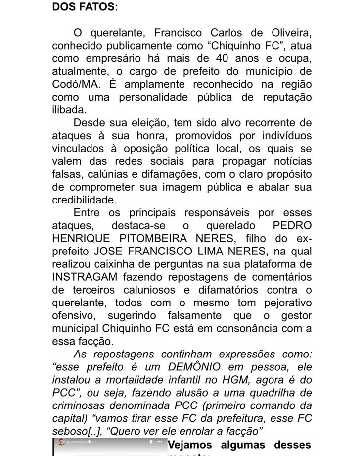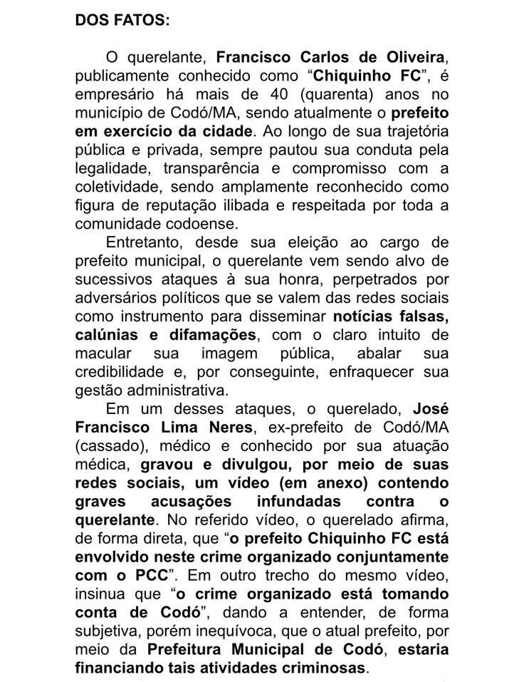 A acessória jurídica do prefeito Chiquinho FC ao tomar conhecimento das calúnias e difamações tanto de Zé Francisco quanto de Pedro Neres, entrou com uma queixa crime contra ambos.
