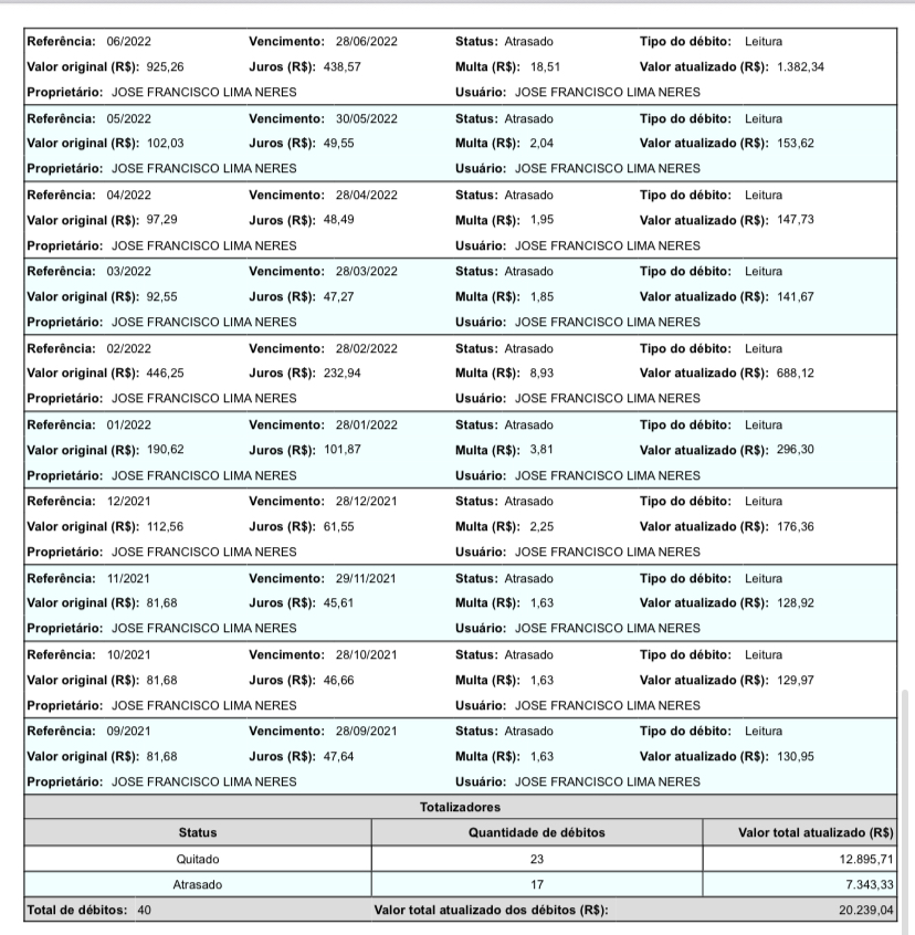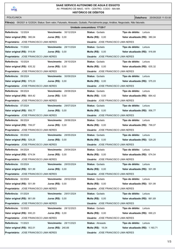 Acompanhe o documento que consta o débito de 20.239,04 de 2021 a 2024 da antiga clínica ultra med com o prédio de propriedade do ex prefeito Zé Francisco que hoje funciona a policlínica.