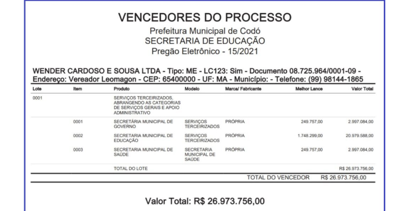 Obtivemos informações que vários ex secretário já foram notificados e respondem por assinar tais contratos com supostos desvios de milhões de reais. Uma das licitações mais conhecidas que levantou a suspeita do Ministério Público do Maranhão foi um contrato firmado entre a prefeitura de Codó e uma empresa com sede em Coroata – MA no valor de 27 milhões de reais.