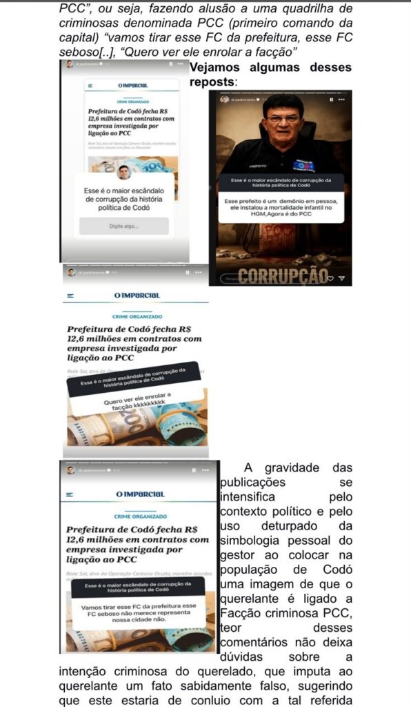 A ação queixa crime foi ingressada na justiça no último dia 7 de setembro de 2025 contra os crimes de difamação e calúnia, ambos previsto no código penal brasileiro Calúnia artigo 138 e difamação artigo 139. Ainda foi pedido a aplicação das causas de aumento previsto no artigo 141 inciso 3, o triplo da pena quando a ofensa é cometida por meio da internet, uma vez que o ex prefeito Zé Francisco e seu filho Pedro Neres, condenado poderão pagar indenização por danos morais e retratação pública nas redes sociais.