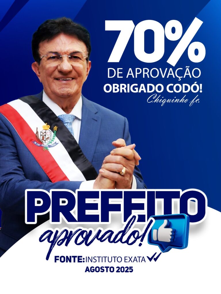 Uma pesquisa de opinião realizada pelo Instituto Exata, no período de 16 a 18 de agosto, revela que o prefeito de Codó, Chiquinho FC, alcançou o indicador de 70% de aprovação popular nos primeiros oito meses de sua gestão, intitulada “Fé, Trabalho e Futuro”. O levantamento reforça a confiança da população no atual governo municipal, que tem se destacado pelo compromisso com o desenvolvimento e pelo esforço contínuo em transformar a cidade.