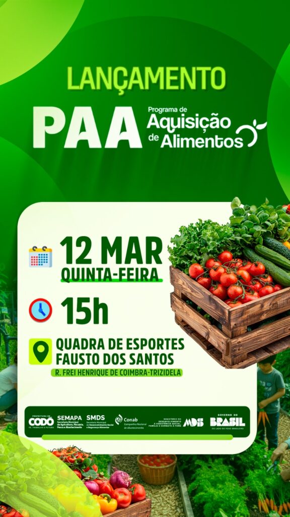 No próximo dia 12 de março, o município de Codó dará início às ações de 2026 do Programa de Aquisição de Alimentos (PAA) com a entrega de 700 Cestas Verdes, totalizando 20 toneladas de produtos oriundos da agricultura familiar. A ação marca oficialmente o lançamento do programa no município neste ano.