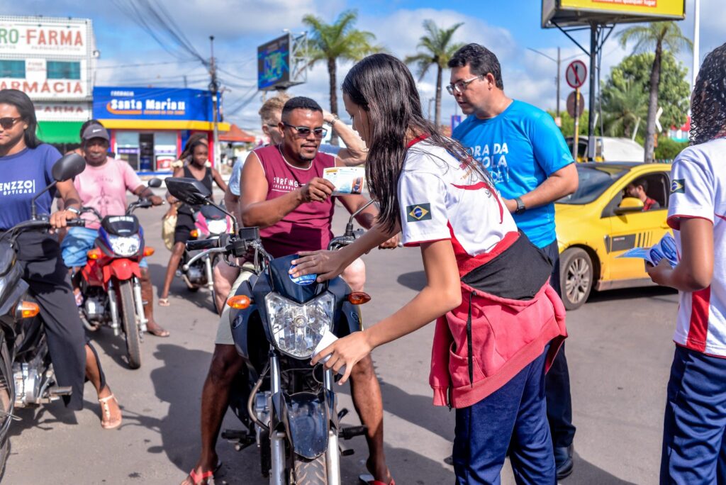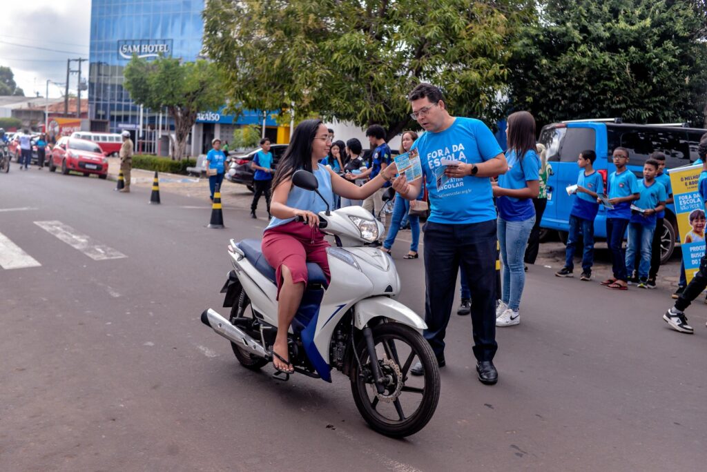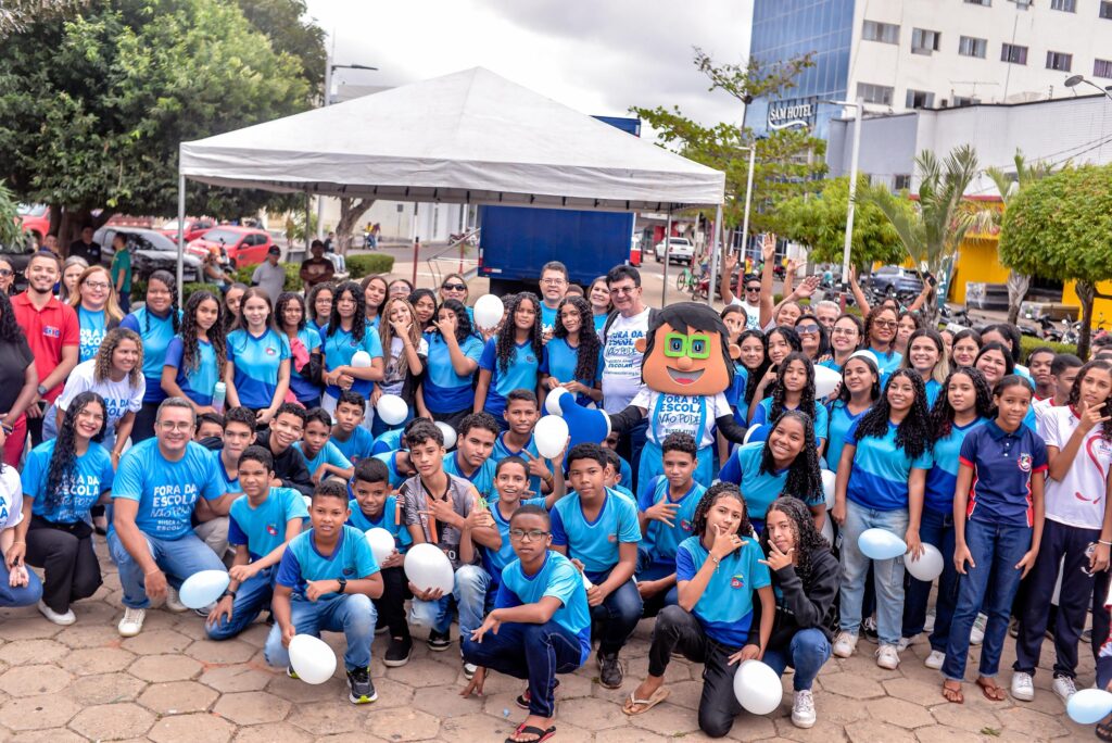 A ação aconteceu na Praça Ferreira Bayma, onde estudantes e professores da rede municipal de ensino realizaram panfletagem e caminharam pelas ruas do Centro, divulgando a campanha e conscientizando a população sobre a importância do enfrentamento da evasão e abandono escolar.