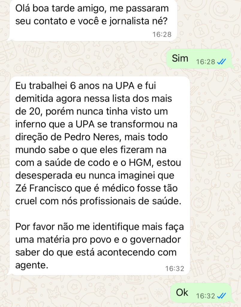 Algo que também é preocupante, é Zé Francisco com sua perseguição implacável aos funcionários da UPA, demitindo os bons profissionais que unidade tinha, incluindo médicos conceituados na região e substituindo na grande maioria dos casos com pessoas que não estão a altura do cargo.